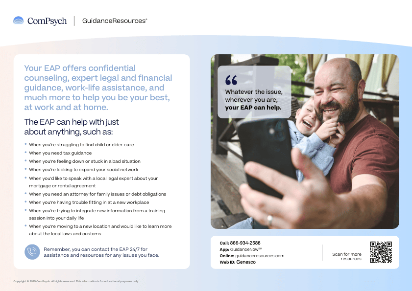 As an employee of Genesco, you have access to the valuable Employee Assistance Program (EAP) at no cost to you and your household members. EAP is confidential and available anytime.