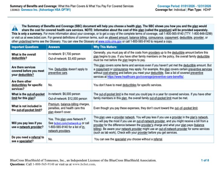 2026 Advantage HSA Individual Summary of Benefits & Coverage (SBC)