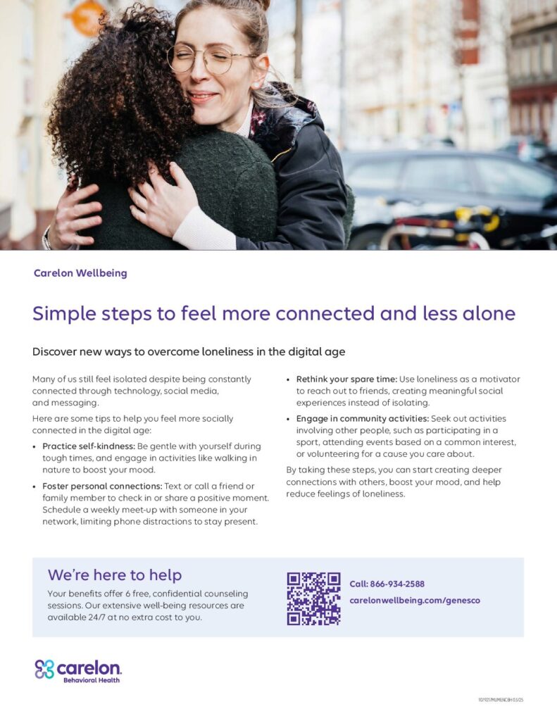 The holidays can be joyful-but they can also bring feelings of loneliness or stress. Remember, you’re not alone. Stay connected by reaching out to friends, volunteering, or joining a local event. Focus on meaningful moments, not perfection. If you’re struggling, our Employee Assistance Program, Carelon offers free confidential support and resources to help you feel more connected and supported this season.